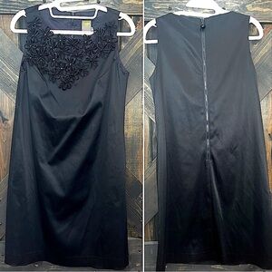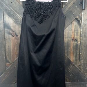 Taylor brand mini cocktail dress. Size 4. Black. LBD. Flower embellishment on neckline. Satin, silky material. Has a faux leather look. Sleeveless. Beautiful dress. Great for special events & parties. Formal. Preloved. Please see all photos for condition. Zipper back.