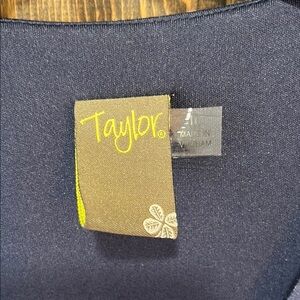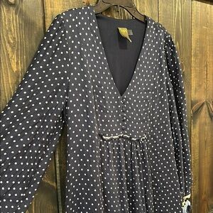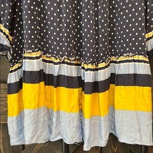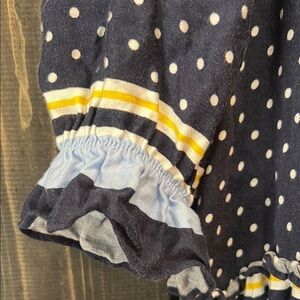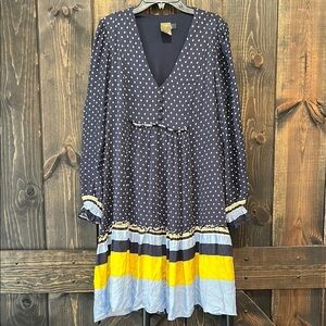 Taylor brand mini to knee length dress. Size 10. Navy blue & white polka dot design with yellow & light blue details. Ruffles. Smocked. Long sleeves. Button look front. Stripes. Boho chic style. Mixed pattern. Adorable. Preloved. Please see all photos for condition. Seams in the back look a little loose (pictured). No holes yet but may need to be mended soon. Solid liner. Stretch material.