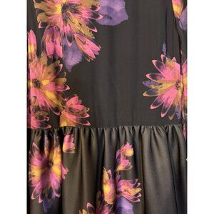 This pretty dress is from Taylor in a misses size 12. Black base with florals in purples, pinks and army greens. Made of polyester/spandex. Lined except for the sleeves. There's a back zipper. A line skirt without pockets. The only stock photo I found was a plus size, used to give you an idea of fit.