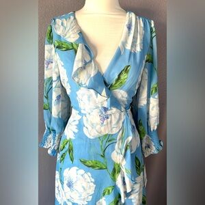 Elegant floral wrap dress in a vibrant blue. Perfect for any occasion.
