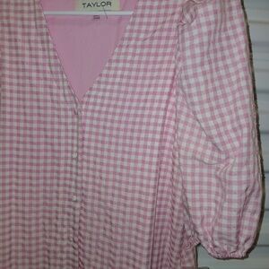 Taylor Gingham Midi Dress V-Neck Puffy Short Sleeves Pink/White Women’s 10 NWT
