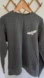 Charcoal gray crewneck pullover sweatshirt with small bird graphic on front, large text on back that reads “Taylor Hawkins LA + London 2022.”