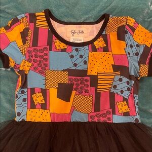 Vibrant patchwork dress featuring a black tulle skirt. Perfect for playful occasions. Halloween is coming up! would be cute w black converse high tops.