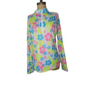 Taylor Jordan Size M/8 Medium Long Sleeve Golf Tennis Top Skort is a versatile addition to any active woman's wardrobe. Perfect for golf, tennis, or general sporty activities. Top is a size M and stand collared neckline, long sleeves, lightweight dotted lightweight fabric, partial zip front, print fabric- Cute skort- Skirt with built in shorts underneath, pleated back, ball pockets on shorts, 2 back slit pockets and skort is bright lime solid and top is multi color print- super cute set