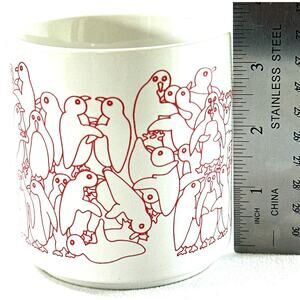 The Taylor & Ng Red Penguin Naughty Coffee Mug 2007 Reissue is a medium-sized ceramic and porcelain mug featuring a novelty design of a penguin engaging in a 1970s style line drawing orgy. This multicolored mug, with a diameter of 3 inches and a height of 3.5 inches, is a humorous and whimsical addition to any kitchen or home decor. Made in Japan and dishwasher safe, this collectible mug is a unique and fun item for all occasions, perfect for those who appreciate quirky and playful pieces.