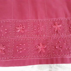 Top has a stand up collar with button opening. Pretty floral embroidered design along the bottom of the top. Pants have