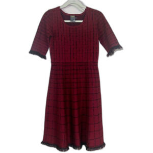 NWOT. Taylor Phillis Sweater Dress Size Small. Fringe at hem and sleeve. Red with black windowpane. Scoop neck.