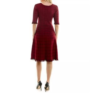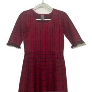 NWOT. Taylor Phillis Sweater Dress Size Small. Fringe at hem and sleeve. Red with black windowpane. Scoop neck.