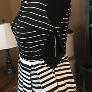 I got this at a boutique while I was traveling and didn't have time to try it on, but it doesn't fit me, so I hope someone else can enjoy it. It would be perfect for a wedding or some other formal event and the neutral colors makes it versatile through the seasons. I can't get it closed on my M/L dress form:m. Laying flat, the waist measurement is 14.5", bust is 17", length of top is 16", and length of skirt is 20". It has pockets! It has some deodorant on the left armpit (picture 5)