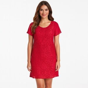Gorgeous red lace dress has a solid matching liner under lace. Front has a scoop neck; back has a V-neck.