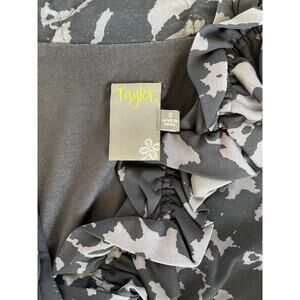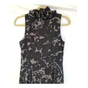 Taylor Ruffle Front Black Grey Sleeveless Sheath Abstract Floral Dress, Size 8