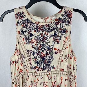 Taylor & Sage sleeveless dress in size small. Crochet lace cutout details on bodice and waist. Bodice and skirt has lining, but waist cutouts do not. Earth tone floral print with navy blue detailing on front of bodice. Great condition. Ships fast from a smoke free home.