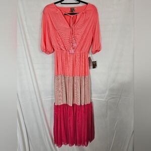 NWT Taylor size 6 blush, pink, and fuschia in 3 stripes horizontally across the skirt of dress. Short, puff sleeves with elastic at hems. V-neckline lined with pull strings and have fringe at ends. Loose, flowy skirt. Elastic waistband. Mesh texture fabric.