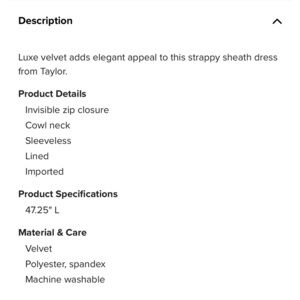Taylor Sleeveless Cami Cowl Neck Solid Velvet Midi Length Dress Size 6