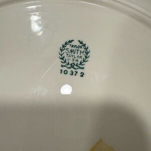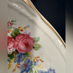 The Taylor Smith TST Vintage Floral Cake Plate is a charming piece of decorative cookware featuring a round shape with a beautiful floral design and gold trim. Made in the USA by Taylor Smith & Taylor, this plate is crafted from fine china, adding a touch of elegance to any dining table or display. The vintage pattern and classic color scheme make it a timeless addition to any home, perfect for serving cakes or desserts with style and sophistication. There are 2 chips on back of plate as shown in pictures