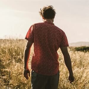This Taylor Stitch shirt features a vibrant red hue with a subtle geometric pattern, perfect for adding a touch of style to your casual wardrobe. Crafted from lightweight material, it offers comfort and breathability for warm weather wear. Its classic button-down design ensures a timeless look for any relaxed occasion.