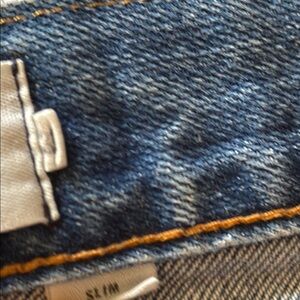 Classic button-fly blue jeans. Comfortable slim fit. There is a small tear in the pocket as shown in the pictures but it is not visible from outside.