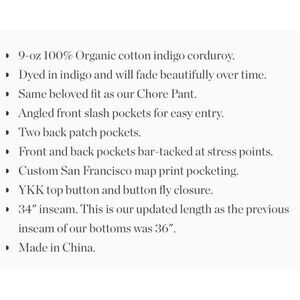 Taylor Stitch The Camp Pant men’s 28 in indigo cord blue corduroy button fly
