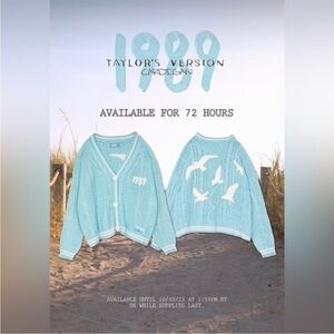 Bright Sky Cerulean Blue with White Varsity Stripe Trim. Embroidered 5 flying bird seagulls on the back to represent 1989 as her 5th album! 1989 is embroidered on the wearer’s front left chest and also a TS patch on the left bottom hem. 3 button closure, oversized fit! Knitted soft and cozy slightly open cable knit.