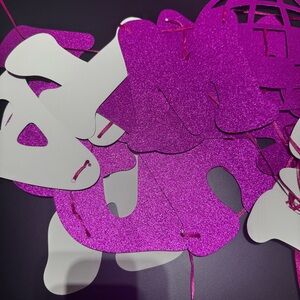 Taylor swift sparkling pink banner, Taylor pics banner & hanger pieces-you need to provide your own ribbons. There is some tape sticky spots on items but not much. As we had it taped to our wall. Good condition