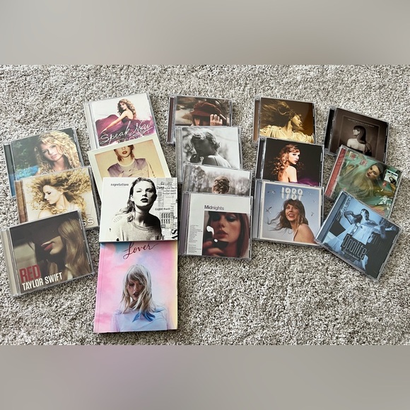 Selection of Taylor Swift CDs and albums. Features recognizable album artwork in pastel and neutral tones. Ideal for fans and music collectors. Ready to enjoy or gift.