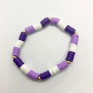 Includes five bracelets as pictured. Eras Tour with gold round and star beads. Speak Now. White and gold beads. Swifties. Purple, pink, white, and gold beads. Made of clay and zinc alloy. Beading may vary from bracelet to bracelet and not be exactly as pictured.