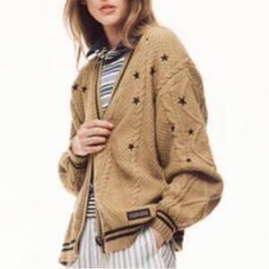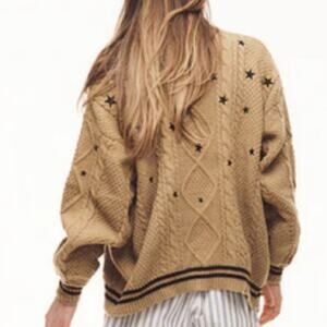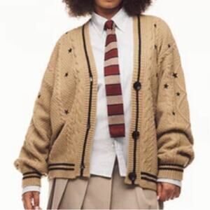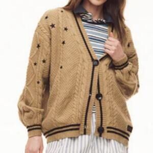 Golden brown button down chunky knit cardigan featuring black knit stripe design and black embroidered star design on front and back with "Taylor Swift Fearless Taylor's Version" woven label on wearer's left hip.