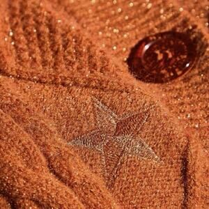 Orange tonal lurex cable knit cardigan featuring orange glitter buttons, 12 lurex embroidered stars on arms, and "T.S." in lurex embroidery on wearer's front