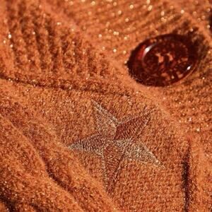 Orange tonal lurex cable knit cardigan featuring orange glitter buttons, 12 lurex embroidered stars on arms, and "T.S." in lurex embroidery on wearer's front