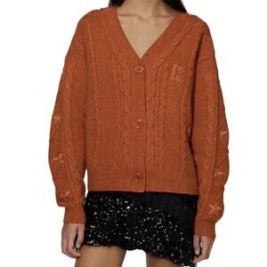 Orange tonal lurex cable knit cardigan featuring orange glitter buttons, 12 lurex embroidered stars on arms, and "T.S." in lurex embroidery on wearer's front