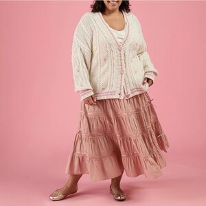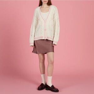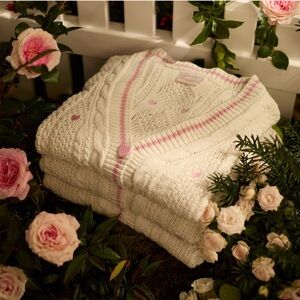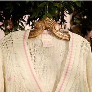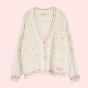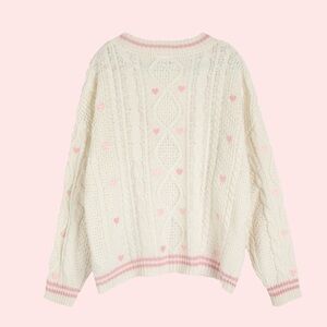 ADORABLE white chunky knit cardigan featuring pink embroidered hearts with stripe design on front and back with heart shaped buttons and "Taylor Swift" embroidered patch on wearer's left hip.