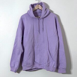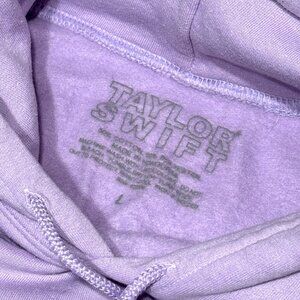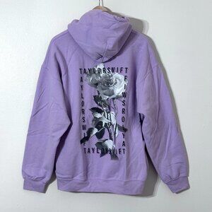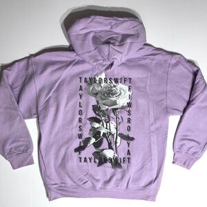 Taylor Swift lavender hooded sweatshirt with black and white rose graphic on the back, front pocket, and drawstring closure on the hood. The front of the sweatshirt is blank with no graphics. Official merch from the 2019 Lover era.