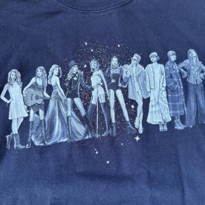 Rounded crew neckline ~ Long sleeves ~ Straight hemline ~ Sweatshirt styling ~ Pullover styling … no closures ~ Soft unlined fabric … front has 10 images of Taylor Swift from different eras … upper back says “Taylor Swift”