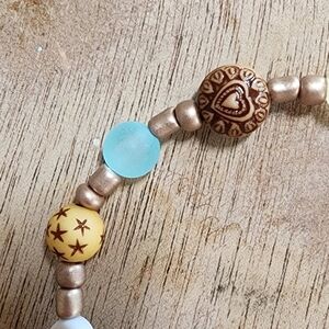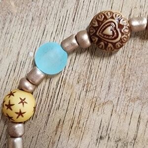 This friendship bracelet was hand-made with a mix of quality glass, wood, and plastic beads. double knotted clear elastic tie.