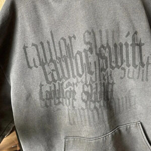 Black oversized hoodie featuring repeating "Taylor Swift" design printed on front with snake design print and the "TS" logo on wearer's right sleeve and the words "There Will Be No Explanation There Will Just Be Reputation" printed on back.