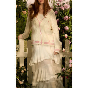 Taylor Swift Lover Cardigan Size Medium Large Eras Tour Swiftie Present. Brand new in packaging. The first 2 photos and 8-12 are from Taylor's website to show what the product is supposed to look like. Cream color with pink embroidered hearts and heart shaped buttons!