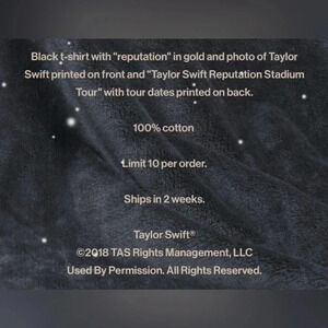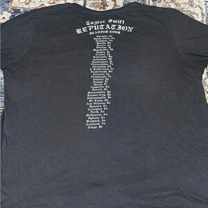 Taylor Swift Stadium Concert International 2018 World Tour Reputation Unisex Short Sleeve Round Neck 100% Cotton Bella + Canvas T-Shirt Adult Size 2XL ~ Pre owned, great condition. No holes, tears, or stains known. Dimensions are approximately pit to pit 24” width, length is 29.5”. Smoke and pet free environment. Colors are dark grey with gold lettering. Please ask any questions you may have PRIOR to purchasing. Ships within two business days! Check out my other hard to find items while you’re here!