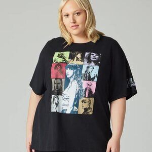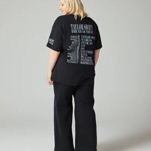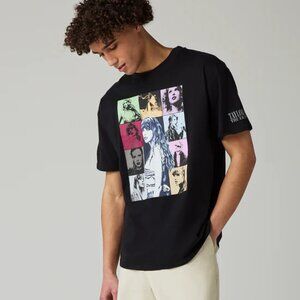 Black t-shirt featuring photos of Taylor Swift printed on front and "Taylor Swift | The Eras Tour" printed on wearer's left sleeve with "Taylor Swift | The Eras Tour", tour locations, and Taylor Swift album titles printed on back.