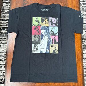 Black t-shirt featuring photos of Taylor Swift printed on front and "Taylor Swift | The Eras Tour" printed on wearer's left sleeve with "Taylor Swift | The Eras Tour", tour locations, and Taylor Swift album titles printed on back.