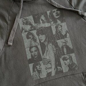 Charcoal hoodie featuring a front pocket with various images of Taylor Swift from each era of her career, printed on the front. Printed on the back of the hoodie is “TAYLOR SWIFT THE ERAS TOUR” followed by a list of the original US tour stops, along with her album titles to the right of the tour locations. “TAYLOR SWIFT” is printed on the right arm of the hoodie, and “THE ERAS TOUR” is printed on the left arm.