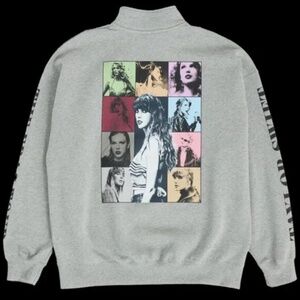 Grey quarter zip fleece featuring "Taylor Swift" printed down wearer's right sleeve and "The Eras Tour" printed down wearer's left sleeve with photos of Taylor Swift printed on back. 80% COTTON, 20% POLYESTER.