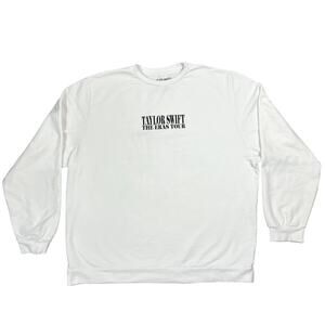 White crewneck featuring "Taylor Swift The Eras Tour" printed on front and photos of Taylor Swift printed on back.