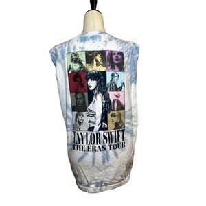 Swiftie essential ๐ This Taylor Swift The Eras Tour sleeveless tie-dye tee (size L) is perfect for concerts, casual days, or layering with your favorite denim jacket. Features a blue and white spiral tie-dye design, bold tour logo on front, and iconic Taylor portraits on the back โ celebrating every era in style. Super soft 100% cotton, slightly oversized fit with raw armholes for that lived-in, vintage vibe.