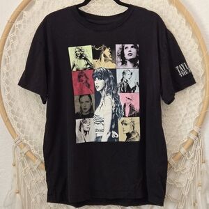 Black t-shirt featuring photos of Taylor Swift printed on front and "Taylor Swift | The Eras Tour" printed on wearer's left sleeve with "Taylor Swift | The Eras Tour", tour locations, and Taylor Swift album titles printed on back.