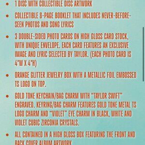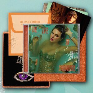 Gorgeous Taylor Swift The Life Of A Showgirl box set! This deluxe CD of TLOAS "Sweat And Vanilla Perfume" edition includes the hard to find violet eye bag charm/ keychain celebrating Elizabeth Taylor!