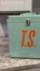 Mint sparkle vinyl case with silver hardware and closure with top handle featuring orange interior and "TS" logo printed on front.