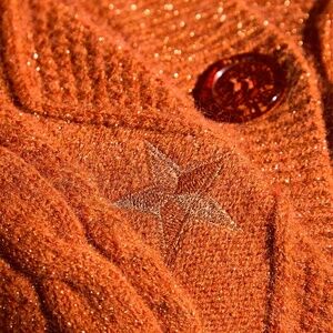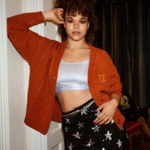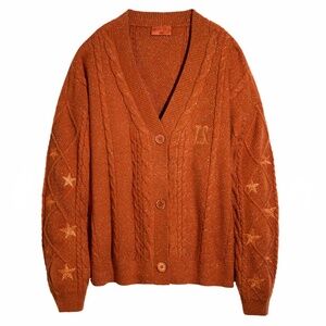 Orange Cable Knit Cardigan with orange glitter buttons, 12 embroidered starts, and "T.S." embroidery on front left chest