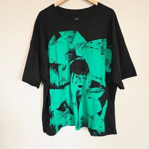 Black t-shirt featuring photo of Taylor Swift and feather mosaic design oversized print in green on front.