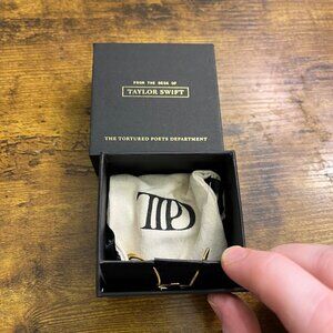 Gold-plated necklace featuring "TTPD" album logo charm, adjustable back closure, and small charm with "Taylor Swift" engraved at clasp. Comes with cotton/poly cinch bag featuring "TTPD" album logo printed on front.