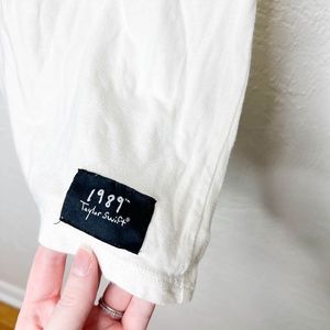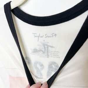 White tee with black trim. Features graphic print on front. Casual and stylish.